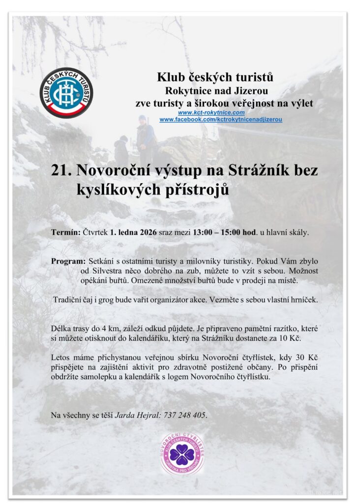 Klub českých turistů Rokytnice nad Jizerou vás zve na 21. ročník Novoročního výstupu na Strážník. Sraz účastníků je naplánován od 13:00 – 15:00 hod. u hlavní skály.