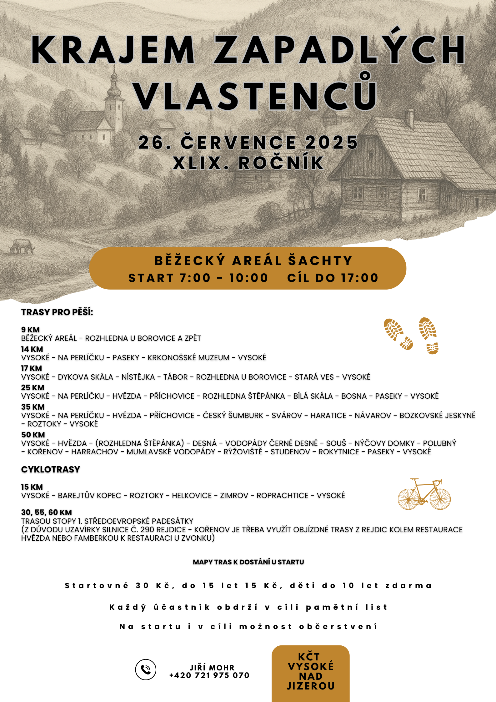 KČT Vysoké nad Jizerou vás zve na turistickou akci zvanou „Krajem zapadlých vlastenců“. Akce se koná 26. července. Vedle pěších...