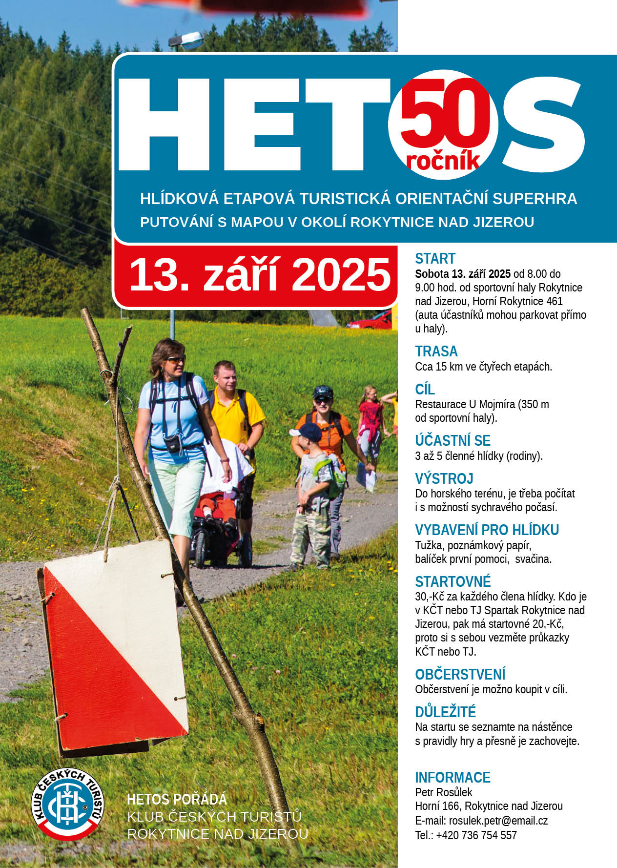 HETOS, to je hlídková etapová orientační superhra. Akce se koná 13. září. Začátek v 8:00 hod. od sportovní haly Rokytnice...