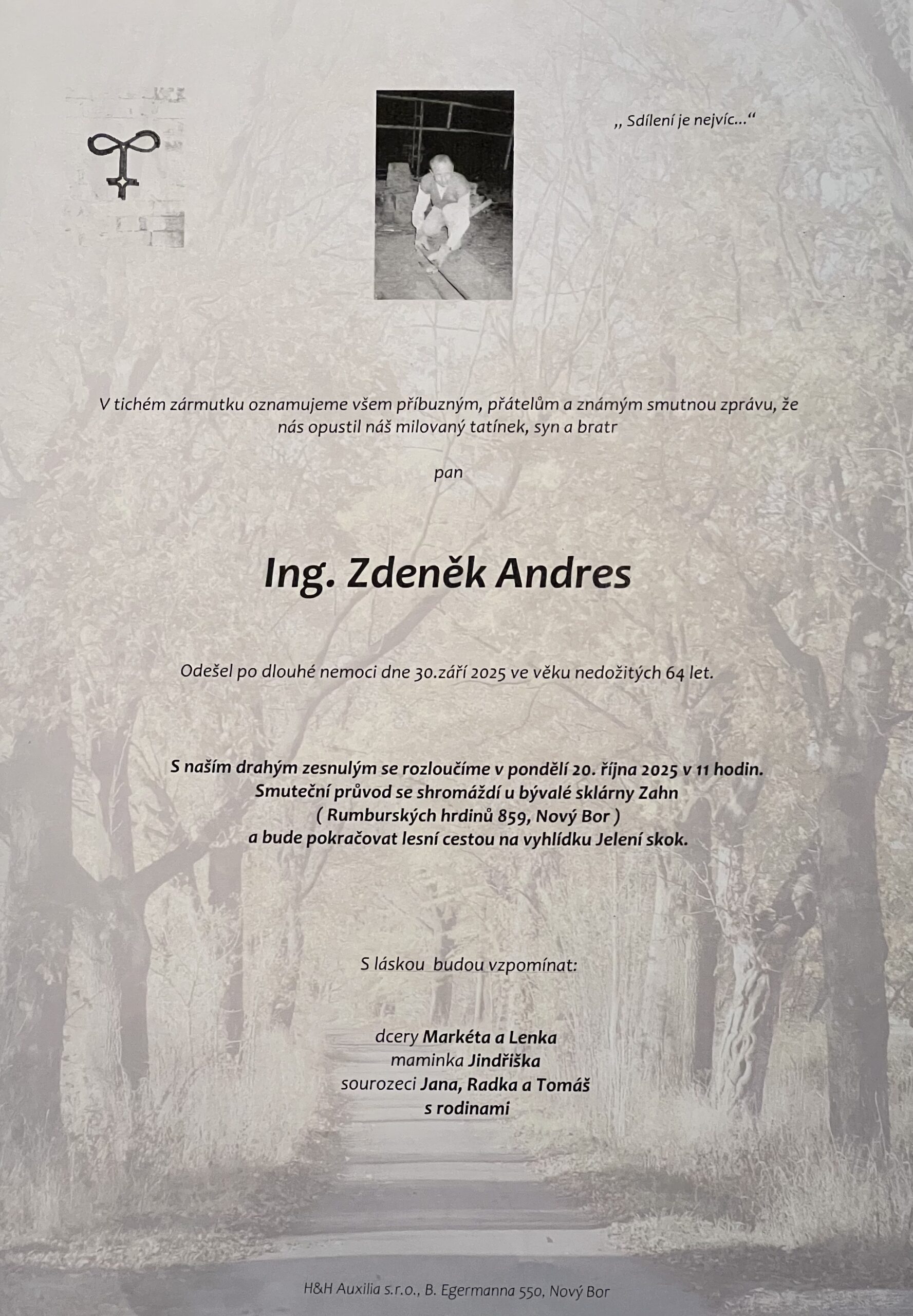 Dne 30. září ve věku nedožitých 65 let odešel Ing. Zdeněk Andres. Ing. Zdeněk Andres byl dlouholetým členem odboru KČT...