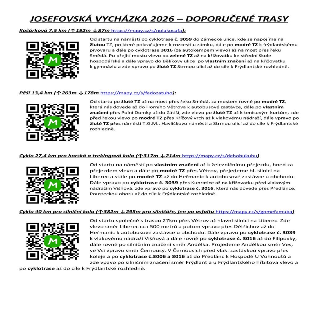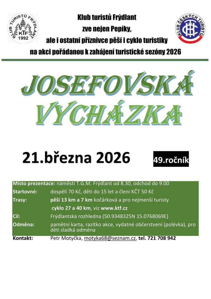 Klub turistů Frýdlant vás zve na tradiční turistickou akci s názvem Josefovská vycházka. Akce se uskuteční dne 21. března. Pro účastníky jsou připraveny pěší, kočárkové a cyklo trasy.