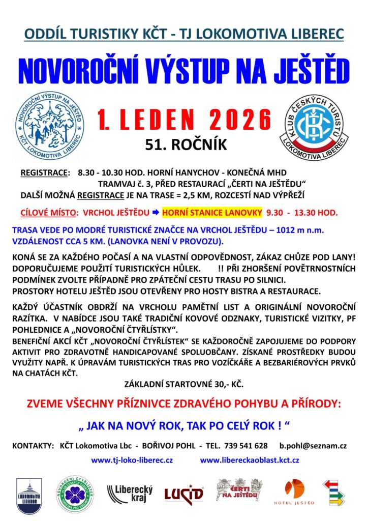 Oddíl turistiky KČT – TJ Lokomotiva Liberec vás zve na 51. ročník akce s názvem „Novoroční výstup na Ještěd“. Registrace akce probíhá od 8:30 do 10:30 hod na konečné MHD Horní Hanychov.
