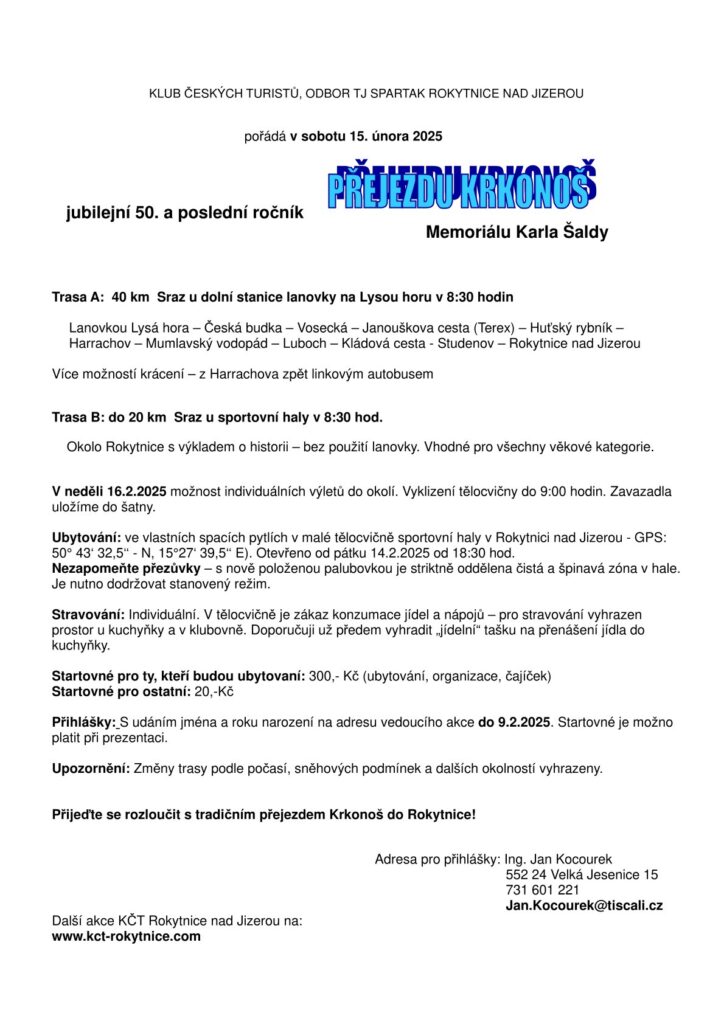 PŘEJEZD KRKONOŠ – Memoriál Karla Šaldy KČT TJ Spartak Rokytnice nad Jizerou vás zve na 50. ročník lyžařského přejezdu Krkonoš. Přečtení: 17