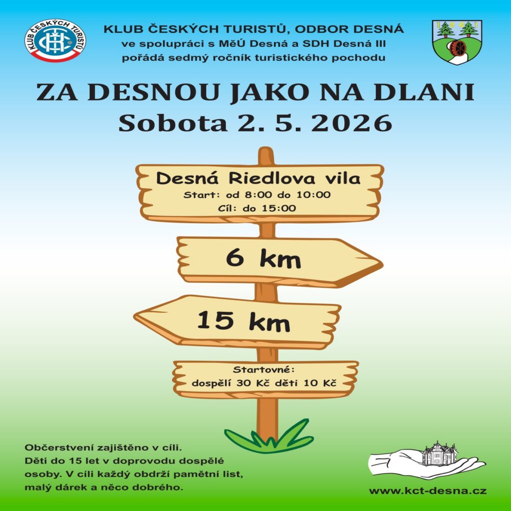 KČT Desná vás zve na turistický pochod „Za Desnou jako na dlani. Akce proběhne 2. 5. 2026. Bližší informace k pochodu najdete na www.kct-desna.cz.